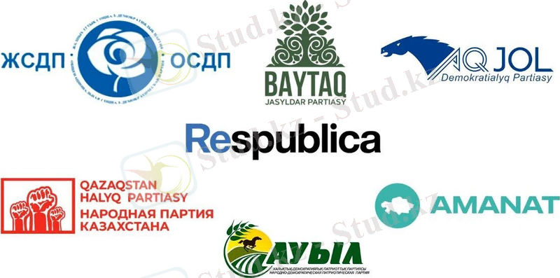 1 суретте елімізде қызмет ететін жеті партияның атаулары мен логотиптері берілген. Олар: