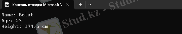 Бұл мысалда Person-бұл үш өрісті қамтитын құрылым: name (жол), age (бүтін сан) және height (бөлшек сан) . Person 1 құрылымының данасы жасалады және оның өрістері инициализацияланады және экранға шығарылады.