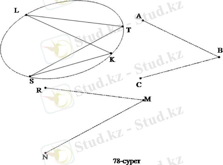 АВС бұрышы және МN түзуі (78-сурет) . Сызбада төбесі М және бір қабырғасы МN болатын берілген бұрышқа тең бұрыш салу керек.
