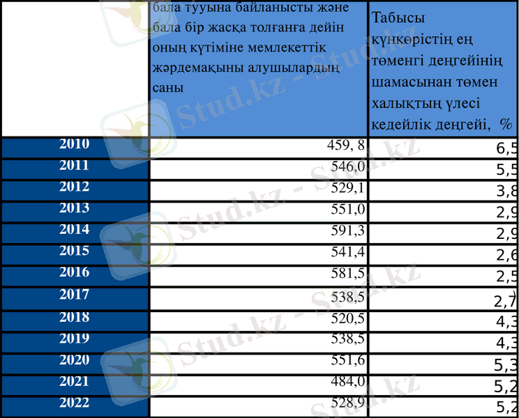 1 кесте ҚР Баланың туылуына байланысты және ол бір жасқа толғанға дейін әлеуметтік қолдау көрсету көрсеткіші.