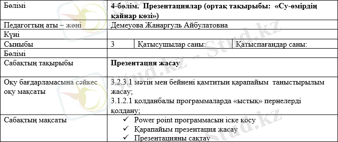 Практикалық сабақта Презентациялар тақырыбында құрастырылған қысқа мерзімді жоспардан мысал келтірейін.