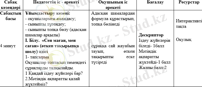 Осы мақсатқа жету үшін мен қысқа мерзімді жоспарда төмендегідей оқытудың белсенді әдістерін қолдандым .