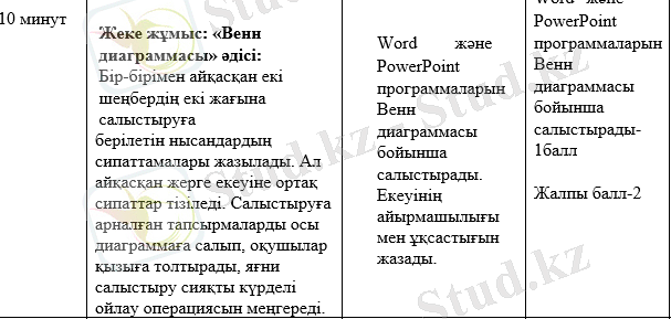3-суретте:«Венн диаграммасы» әдісін сабақтың ортасында Word және Power point программаларының айырмашылығын тауып, салыстыруға қолдандым. Салыстыруға арналған тапсырмаларды осы диаграммаға салып, оқушылар қызыға толтырады.