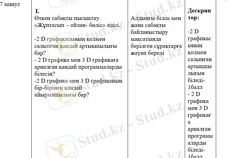 Ойлану: Оқушыларға берілген тақырып бойынша жеке ойлау немесе сұраққа жауап беру талап етіледі.