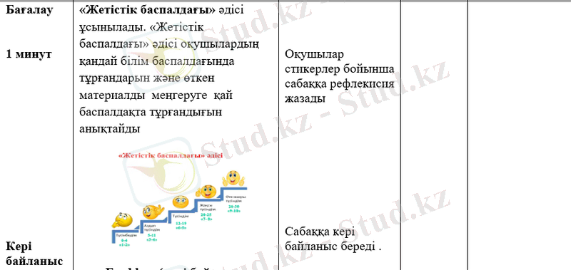 Оқушылардың қандай білім баспалдағында тұрғандарын және өткен материалды меңгеруге қай баспалдақта тұрғандығын анықтайды. Баспалдақ тақтаға ілінеді (ватманда, қағаз парағында), балалар өздері орындаған жұмысты магниттермен немесе стикерлермен өздері қалаған баспалдаққа орналастырады. Не үшін ондай баға қойғандарын түсіндіреді:Өте жақсы түсіндім. Жақсы түсіндім. Түсіндім. Аздап түсіндім.