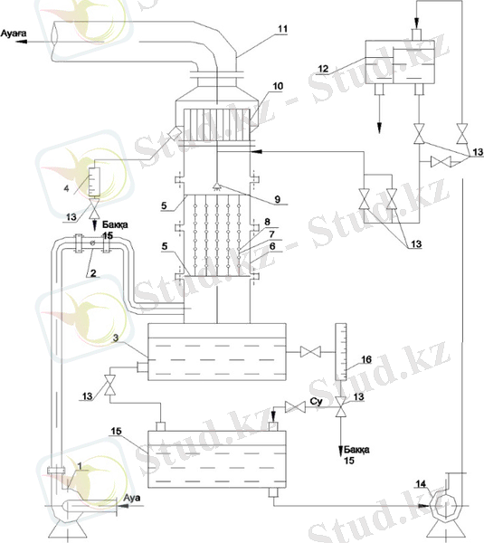 Қондырғының технологиялық схемасы 1. 1-суретте көрсетілген. Қондырғының жұмыс аймағының биіктігі 1, 3м. Газ ағыны қондырғының төменгі жағынан беріліп аппараттың жұмыс аумағынан өтеді. Аппаратың төменгі және жоғарғы жағында тірек-бөлгіш торларлар 5 орналасқан. Осы екі тірек торларға ішекпен 9 керіліп жүйелі жылжымалы шарлы саптамалар бекітілген.