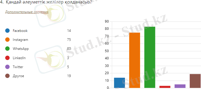 Бұл сұрақ кәзіргі таңда халық арасында қай әлеуметтік желі танымал екендігін анықтауға көзделген. Респонденттер арасындағы қолданыста ең танымал екі әлеуметтік желі Whatsapp пен Instagram, сәйкесінше 83 және 75 жауап жинаған. Ал Facebook, Twitter, LinkedIn 14 жауаптан аса алмай қайда артта қалып кетті. “Другое” жауаптарының сараптай респонденттердің, көп болмаса да, кейбіреулері TikTok, Youtube, Telegram желілерін қолданатынын атап өтті. Осы жауаптар бойынша теория бөліміндегі 2016 жылғы ақпарат ескіргені туралы ой түйуге болады.