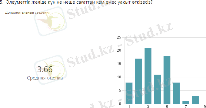 Бұл сұрақ респонденттердің әлеуметтік желілерде қанша уақытын өткізетінін анықтау үшін арналған. Орта есеппен 3, 66 немесе 3сағат 40минутқа шақ өткізеді. Әлеуметтік желілермен 4 сағатқа дейін қолданатын адамдар саны 57 ал одан артық, яғни шамадан тыс қолданатын респонденттер саны 30-ға тең.
