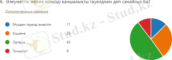 Forms платформасында әр түрлі жастағы және гендерлік топтағы қазақстандықтар арасында жүргізілген сауалнама негізінде мынадай қорытынды жасауға болады: сауалнамада әйелдер басым болды (62%), бұл олардың әлеуметтік желілерге деген қызығушылығының да басым екенін көрсетеді. Қатысушылардың көпшілігі (86%) әлеуметтік желілерді пайдаланады, Whatsapp пен Instagram ең танымал. Әлеуметтік желіде өткізілетін уақыт орташа есеппен 3 сағат 40 минутты құрайды, респонденттердің кейбірі (9%) тәуелдімін деп хабарлады. Әлеуметтік медианы пайдаланудың мақсаттары көңіл көтеруден білім беру мақсаттарына дейін, соның ішінде жақын адамдармен сөйлесу және ақпарат алуға бөлінді. Пайдаланушы қызығушылығы білім, жаңалықтар және денсаулық туралы ақпарат сияқты әртүрлі мазмұн тақырыптары бойынша да таратылады.