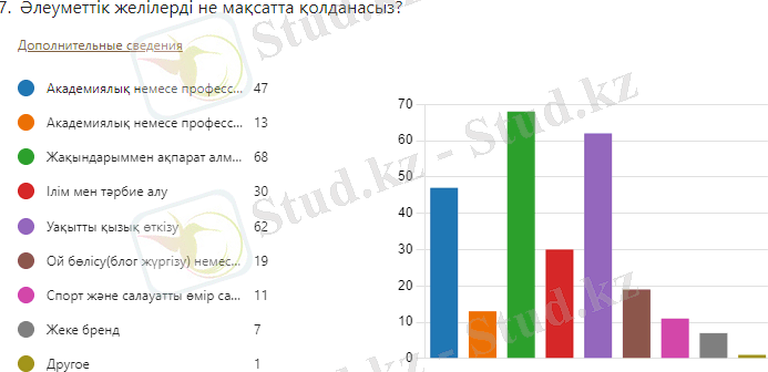 Жетінші сұрақтың нәтижесі бойынша академиялық не профессионалды білім алу мақсатында қолданатын адамдар саны 47, ал сондай ақпаратпен бөлісетін адамдар саны 13. Желі қолданудың ең жиі мақсаттар көңіл көтеру мен жақындармен әңгімелесу 62 және 68 жауап. Ілім тәрбие мақсатында 30 жауап, салауатты өмір салты туралы ақпар алу 11 және жеке бренд жауабы 7 жауап жинады.