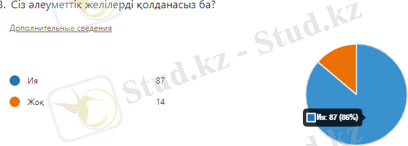 Үшінші сұрақ соңғы сұрыптаушы сұрақ. Әрине респонденттердің басым бөлігі “Ия” деп жауап қатты, 86%, яғни 87 адам, ал қалған 14 адам әлеуметтік желімен мүлдем қолданбаймыз деп жауап қатты. “Жоқ” деп жауап бергендерге сауалнама осы жерде аяқталады.