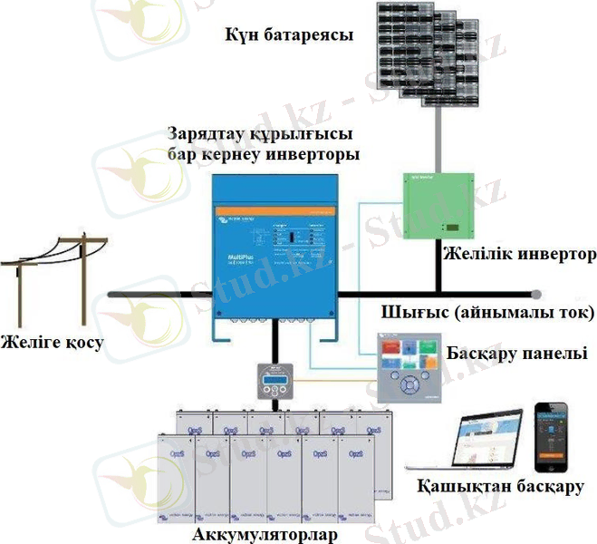күн панельдері, MPPT контроллері, батарея, гибридті инвертор, сирек дизельді генератор.