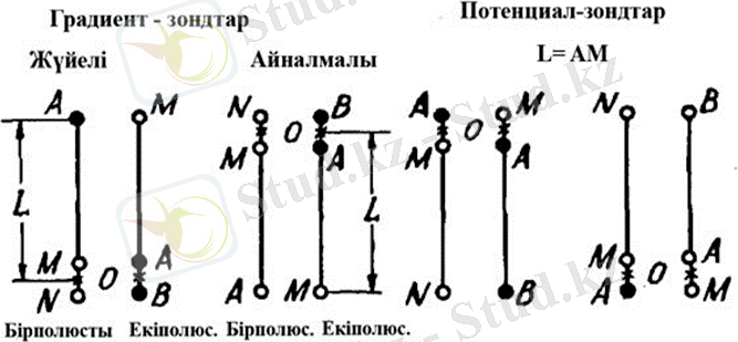 Градиент зондтың ұзындығы L деп алсақ онда екі қашық орналасқан электрод пен жақын орналас-қан электродтар ортасына дейінгі ара қашықтық L=AO немесе L=MO ал потенциал зонд үшін барлық уақытта L=AМ