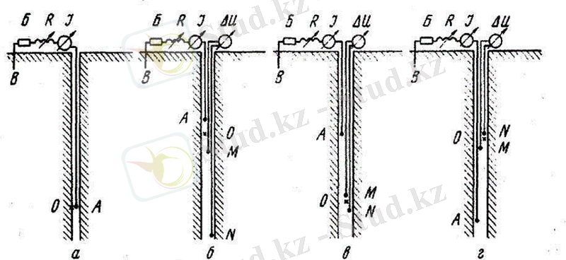 Б - батарея немесе басқа қоректендіру көздері, R - тоқ күшін реттейтін реостат, I - тоқ күшін өлшеуші аспап, MN -өлшеуші электродтар, ∆U - потенциалдар айырмашылығын өлшейтін аспап, О -жазу нүктесі; а - тоқты каротаждың бір электродты зонды, б - үш электродты потенциал-зонд, в - үш электродты табандылық градиент-зонд, г - үш электродты жабындылық градиент-зонд.