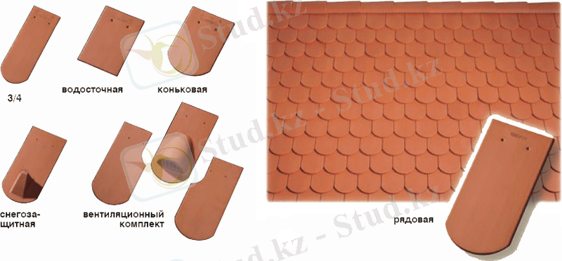 Керамикалық черепицаның мынандай түрлері бар: пазалық черепица, S - бейнелі черепица, монах черепицасы, конькилік черепица, жазық ленталық черепица. Бұл курстық жоба бойынша черепицалардың ішінен S - бейнелі черепицаны таңдалынды. Жабынқы бұйымның өлшемдері ұзындығы 345мм, ені 175мм, ауқымды өлшемі ұзындығы 395мм, ені 217мм. ЧК-S-395х217/345х175/ГОСТ Р 56688.Масса 1м 2 болатын керамикалық шатырлы бұйымның пазалық немесе S - бейнелі черепицаны суға қаныққан күйі 54 кг аспауы тиіс.