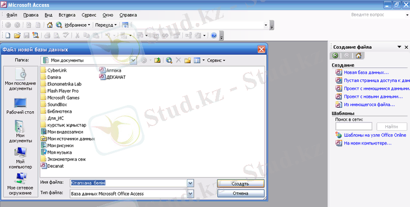 - Егер ондай бұйрық жоқ болса, Файл-Создатьбұйрығын орындасақ, Access-теСозданиетерезесі пайда болады.