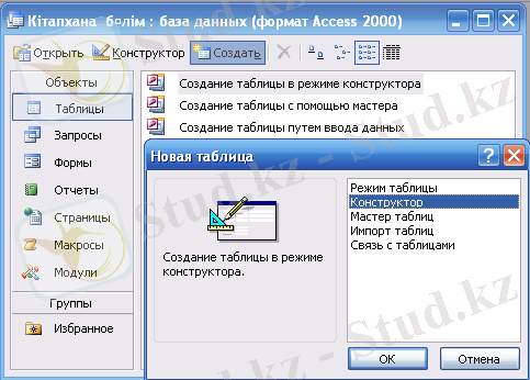 - Кітапхана бөліміатты деректер базасының терезесіненТаблицы-Создатьобъектісін таңдаймыз.