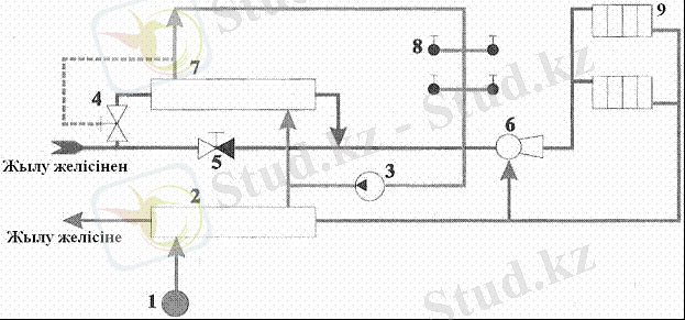 1-сурет Ыстық сумен қамтудың бір сұлбасының сұлбасы тізбектеліп қосылғын екі сатылы су-сулық қыздырғышы бар жылулық орын үшін: 1 ішетін су құбырының суы; 2 - төменгі саты су-сулық қыздырғыш; 3 - айналу сорғысы; 4- температура реттегіш; 5 - шығыс реттегіш; 6 элеватор; 7 - жоғары саты су-сулық қыздырғыш; 8 ыстық су алу шүмегі; 9 - ғимарат жылыту аспаптары.