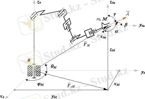 Нысанның кеңістіктегі бағыты негізгі координаталар жүйесінің осьтеріне қатысты бағдарлау векторын құрайтын α, β және γ бұрыштары арқылы анықталады. 1. 3 - суретте [] айналмалы кинематикалық жұптары бар алты осьті манипулятордың схемасы, манипуляцияланатын объектінің орналасуы көрсетілген.