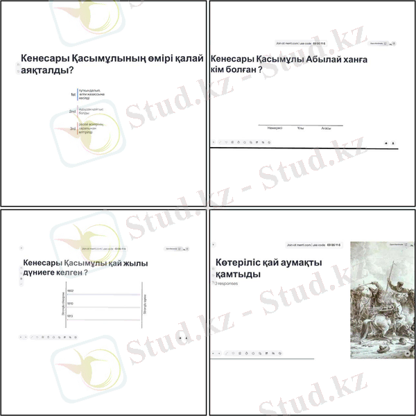 Тапсырма бойынша Mentimeter бағдарламасы арқылы өзің қалаған тақырыпта сауалнама жасау. Яғни сұрақ жауап түрінде. Менің таңдаған тақырыбым - «Кенесары Қасымұлы».