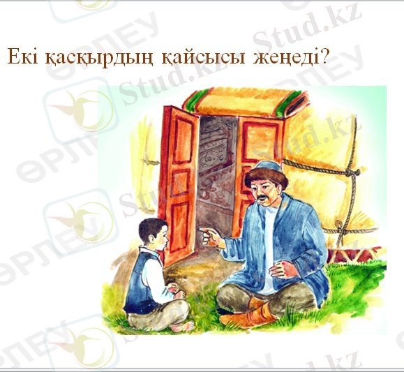 «Қасқыр ғой» деп жауап беріпті. Сәл ойланып отырған немересі сұрағын жалғастырып: «Ал, еңбекқорлық, білмекке құмарлық, талап, сүйіспеншілік, мейірімділік сияқты қасиеттер неге жатады?» деген сауал тасталғанда, атасы: «Олар да қасқыр» деп жауап беріпті. Немересі аз-кем отырғаннан кейін