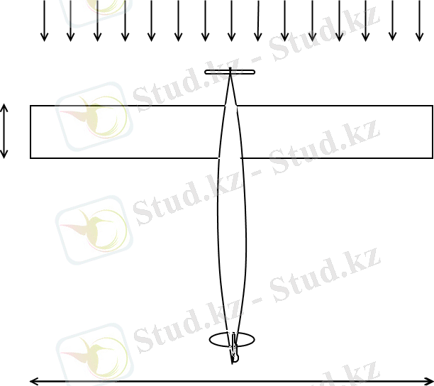 2) ұшақ қанатынан өтетін ауа ағынының импульсінің өзгерісін қарастыра отырып, ( абсолют жылдамдық шамасының өзгерісін ескермейміз), ұшақ қанатына әсер ететін L қанатты көтеру күші мен D 1 көлденең бағытта тарту күшін есептеу үшін, қанаттың өлшемдеріне, ағынының жылдамдығына υ және ауа тығыздығына ρ байланысты, өрнек аламыз. Ауа ағынының бағыты барлық жерде сызба жазықтығына параллель деп есептейміз.