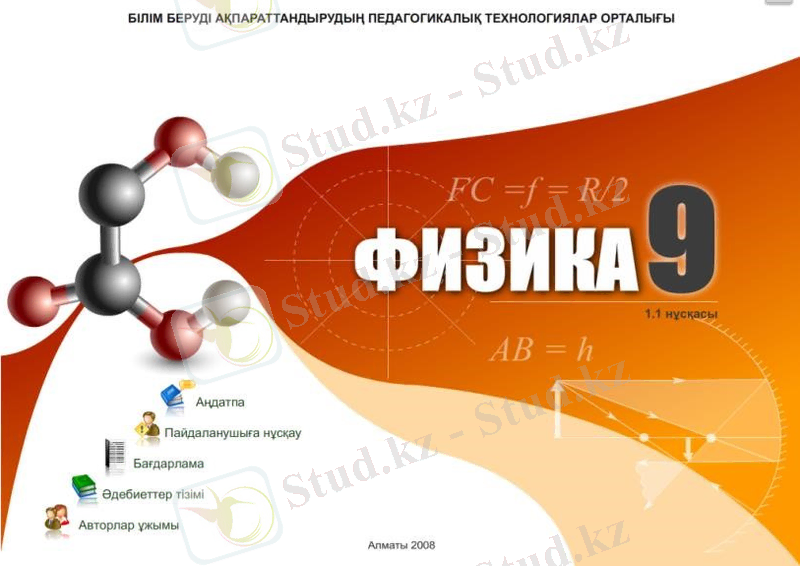 Осыған байланысты Білім беруді ақпараттандырудың педагогикалық технологиялар орталығы дайындаған 9 сыныпқа арналған физика пәнінен электронды оқулықты қарастырайық. Бұл оқулықтың алғашқы бетінде аңдатпа, пайдаланушыға нұсқау, бағдарламалар, әдебиеттер тізімі және авторлар ұжымы берілген, мұнда оқушы электронды оқулық жайлы толық мәлімет ала алады, танысады (1-сурет) .