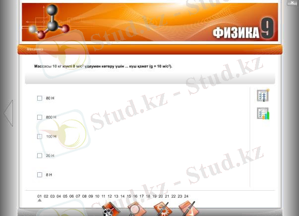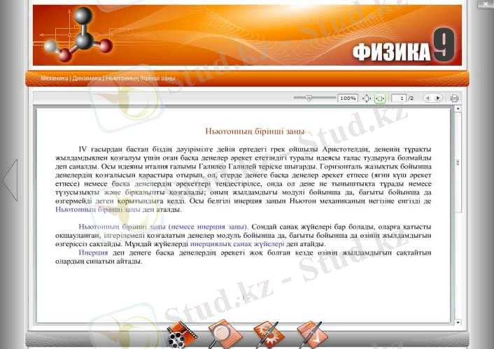 3-суреттен көріп отырғанымыздай, 9-сыныптың электронды оқулығында Физиканың 4 тарауы көрсетілген, сол беттің төмен жағында 18 анимацияланған аудиодыбысталған бейнематериал (демонстрация) берілген, оқушы көру әрі есту арқылы сабақты толық қабылдауға мүмкіндік алады (3-сурет) ; мәтін, яғни Динамика тақырыбына арналған мәлімет келтірілген (4-сурет) ; 2 зертханалық жұмыс (5-сурет) мұнда берілген тақырып бойынша есептеуге арналған өлшемдердің мәнін өзгертіп, қайта-қайта жаттығуға болады және сабақ соңында сол тақырыпқа арналған 24 сұрақтан құралған тест жұмысы (6-сурет) арқылы оқушы өз білімін бекітуіне болады.