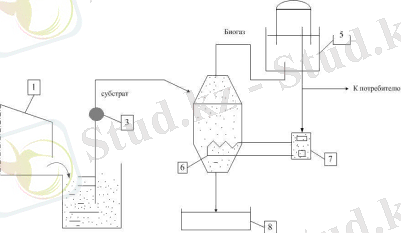 1-ферментатор, 2-бастапқы субстрат сыйымдылығы, 3-тыңайтқыш сыйымдылығы, 4-биогазды сүзу жүйесі, 5-тарату қондырғысы, 6-газ ұстағыш, 6 - газ электр генераторы, 8-электролизер