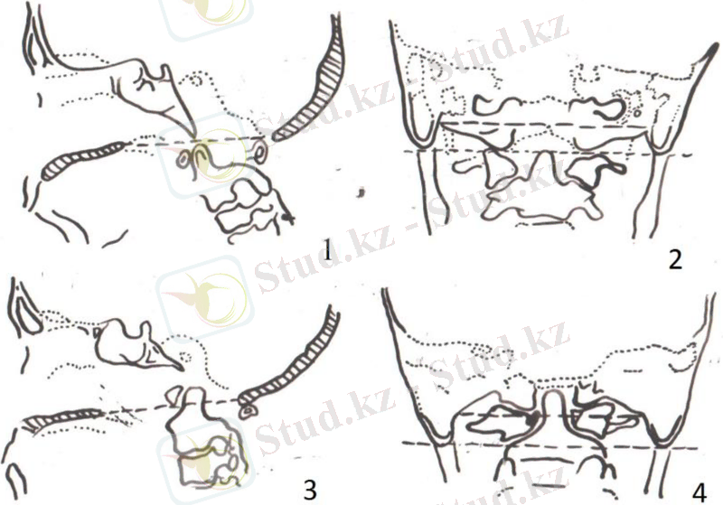 Сурет 2 . Базилярлы импрессия кезінде II мойын омыртқасының тіс тәрізді өсіндінің биіктігің рентгеннограммада өлшеу әдісі. 1, 2 - қалыпты; 3, 4 - базилярлы импрессия.