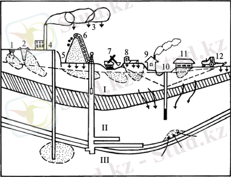 1 - құбырлар; 2 - қалдық қоймасы; 3 - түтін және газ шығарындылары; 4 - өндірістік қалдықтарды жер асты көму; 5 - шахталық су; 6 - қоқыс үйінділері; 7 - карьер сулары; 8 - жанармай құю станциялары; 9 - тұрмыстық ластану; 10 - су алу, тұзды суды тарту; 11 - мал шаруашылығы объектілері; 12- тыңайтқыштар мен пестицидтерді қолдану