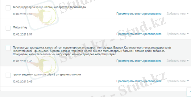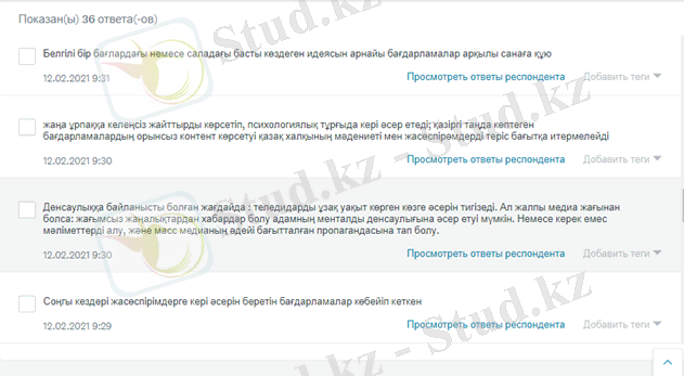 3. 2. Зерттеу қорытындысыЗерттеу жұмысына аталмыш практикалық әдіс өз пайдасын тигізді. Өйткені ғаламтордан алынған ақпараттардан бөлек респонденттердің жауаптары жаңа ойларға әкеліп, жағдайға өзгеше перспективадан қарауға мүмкіндік берді. [8]