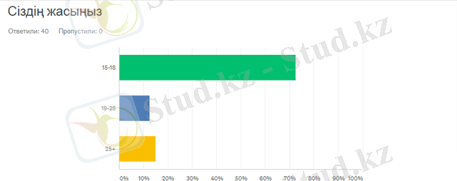 Сауалнама аудиториясы 15-18 жас арасындағы кіші жасөспірімдер (72, 50%) мен 25 жастан жоғары ересек адамдар (15%) . Сауалнама аудиториясының аз бөлігі 19-25 жас аралығындағы жас азаматтар мен азаматшалар (12, 50%) . [9]