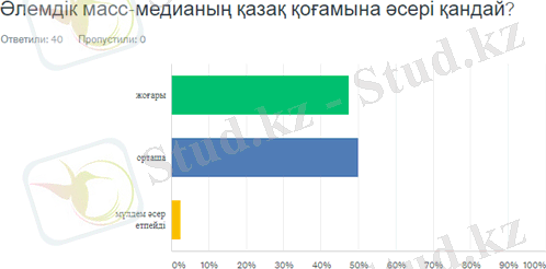 Осы сұраққа жауап берушілердің көбісі әлемдік масс-медияның қазақ қоғамына әсерін жоғары (47, 50%) және орташа (50%) деп біледі. “Мүлдем әсер етпейді” жауабы өте аз (2, 5%) көрсеткішіне жетті. [10]