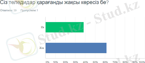 Сауалнамадан өткен адамдардың көп бөлігі, яғни 61, 54% теледидар қарағанды ұнатпаса, қалған 38, 46% теледидар қарауға қызығушылық танытатын болып табылды.