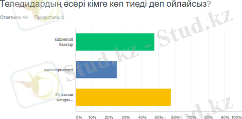 Жауап берушілердің салыстырмалы түрде көп бөлігі (57, 5%) теледидар 40 жастан жоғары адамдарға өте әсерлі деп біледі. Сауалнама өткендердің келесі бөліктері кішкентай балаларға (47, 5%) және жасөспірімдерге (25%) деп анықтады.