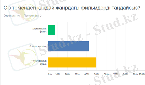 Сауалнама қатысушыларына ұсынылған ең әсерлі жанрлардың бірі болып табылатын 3 нұсқадан трагедиялық драма (50%) таңдауда басым болды. Демек, боевик, қылмыс (42, 5%) және қорқынышты фильм (7, 5%) көрсеткіштеріне ие болып, екінші және үшінші болып жайғасты.