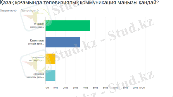Зерттеудің практикалық әдістің қатысушылары қазақ қоғамында телевизиялық коммуникациясы ел ішінде идеяларды насихаттайды (45%) десе, адамдардың 35% “Қазақстанды әлемдік аренада танытады” деген жауап берді. Қазақтар үшін “әлеуметтік институттар дамиды” және “ешқандай маңызды рөль аткармайды” деген жауаптар бірдей болып, екеуде тиісінше 10% болып тіркелді.