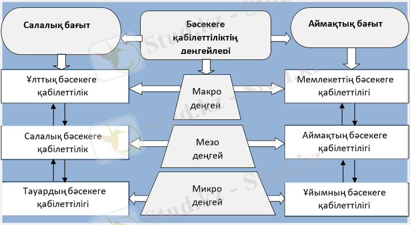 «Бәсекеге қабілеттілік» ұғымы әртүрлі деңгейлердің категорияларына қатысты қолданылады: макро деңгей, мезо деңгей және микро деңгей. Бәсекеге қабілеттіліктің қазіргі теориясында деңгейлер бойынша бөлудің екі көзқарасы бар: аймақтық және салалық. Бәсекеге қабілеттіліктің әртүрлі деңгейлерінің өзара байланысын көрнекі түрде көрсету үшін біз келесі схеманы қолданамыз. (1 сурет)