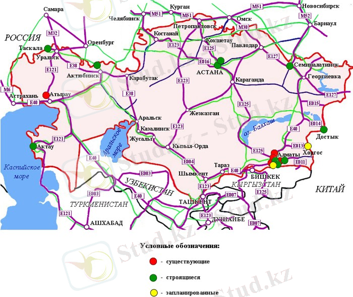 Қазақстан арқылы жалпы ұзындығы 23 мың километрді құрайтын 5 халықаралық автомобиль жолдары өтеді. (1-сурет)