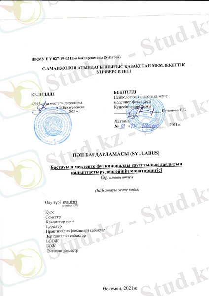Мақсаты: Студенттерге бастауыш мектепте функционалдық сауаттылықты қалыптастырудың ерекшеліктерін теориялық және практикалық тұрғыдан меңгерту. Кәсіби деңгейі жоғары, жан-жақты дамыған, білім нәрімен, сусындаған, теориялық білімі терең, практикалық дағдысы қалыптасқан, ұлттық минталитеті жоғары маман даярлау.