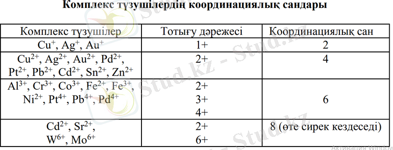 3. Комплекс түзушінің маңайына орналасқан лигандалардың жалпы саны комплекс түзушінің координациялық саны (к. с. ) болып табылады.