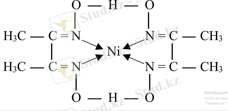 Никель (ІІ) диметилглиоксиматы - қызыл түсті төрт циклді комплекс. Бұл қосылыста екі ковалентті, екі донорлы-акцепторлы байланыс және сутекті байланыстар бар. Бұл комплекс никельді анықтауға қолданылады. Циклді комплекстер хелатты комплекстер деп те аталады. Бұлар көп дентантты комплекстер. Хелатты комплекстерге хлорофилл және гемоглобин жатады. Хлорофилде комплекс түзуші - Mg, (комплекс жасыл), ал гемоглобинде - Fe (комплекс қызыл) .