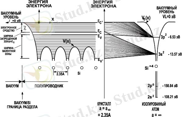 Сурет 1. 1. Изоляцияланған кремний атомындағы энергетикалық деңгейлер құрылымы, сондай-ақ, осы атомдардың жақындасуы кезінде пайда болатын монокристалдық кремнийдің энергетикалық зоналарының схемалық құрылымы