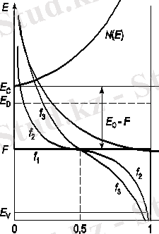 Сурет. 1. 4. N(E) өткізгіштік аймағындағы күй тығыздығының таралу функциясы, Ферми-Дирак F және Больцман fб функциялары