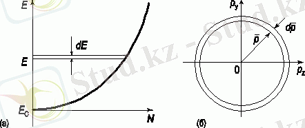 , яғни, dp-бұл px, py, pz квази-импульстік кеңістігіндегі белгілі бір көлем, яғни Бриллюен аймағының ішінде, ал dV - жартылай өткізгіштің ішіндегі белгілі бір көлем. Сонымен қатар, dV көлемі міндетті түрде шексіз шама емес. Бұл ақырғы болуы мүмкін. Заряд тасымалдаушылардың концентрациясын есептеу үшін (яғни жартылай өткізгіштің көлем бірлігіндегі тасымалдаушылар саны) Кристалл ішінде DV = 1 см3 бірлік көлемін бөлеміз. Содан кейін (1. 2) біз DP ≤ h3 аламыз. Яғни, Гауһар аймағында dp = h3 көлемінің ішінде тек бір кванттық күй болуы мүмкін, ол бүкіл көлемде бұлыңғыр болып көрінеді. Сонымен, h3-бұл Бриллюен аймағындағы бір "пәтердің" көлемі, оған әр түрлі спиндері бар екі электронды ғана орналастыруға болады және артық емес. Сондықтан бриллюин аймағындағы dp көлем элементіне сәйкес келетін және кристалл көлемінің бірлігіне есептелген кванттық күйлер саны dp/h3 - ге тең, яғни dp көлеміндегі "пәтерлер" саны. Өткізгіштік аймағын электрондармен толтырған кезде алдымен ең төменгі деңгейлер толтырылады. Өткізгіштік аймағы энергияға қатысты бір өлшемді (сурет. 1. 3 а) . Бриллюен аймағы - үш өлшемді (px, py, pz) (сурет. 1. 3 б) . Бриллюин аймағын толтыру квази-импульстің ең кіші мәндерінен басталады p. сондықтан dp ретінде екі өте жақын изоэнергетикалық беттер арасында орналасқан көлем элементін таңдау керек (суретті қараңыз. 1. 3 б) . Бұл жұқа шар қабатының ішінде радиусы P және қалыңдығы DP кванттық күйлер саны тең болады: