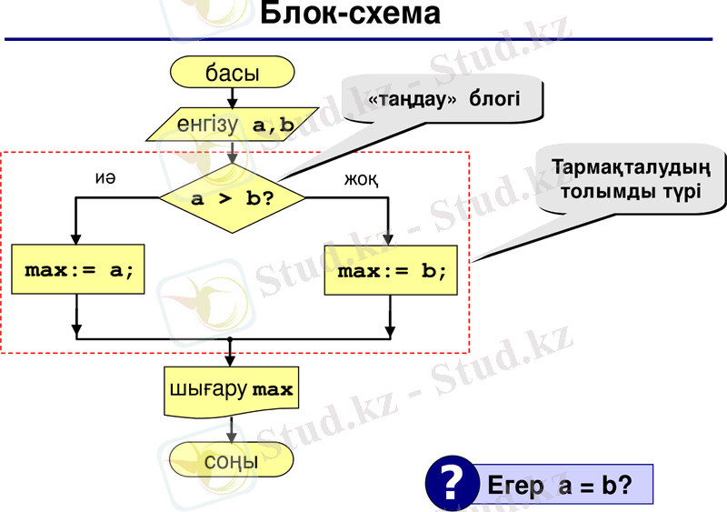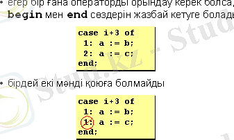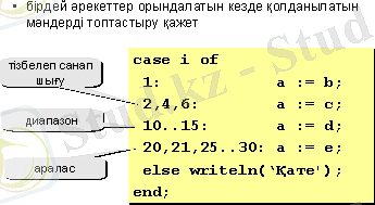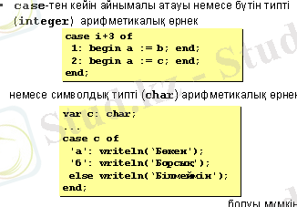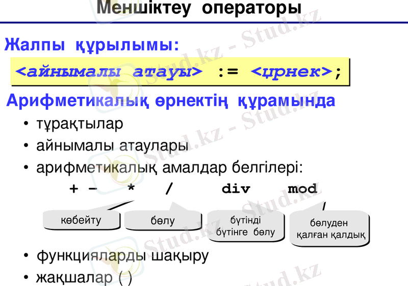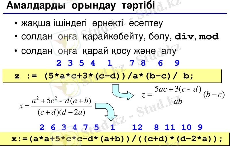 Соңғы оператордағы өрнектің бүтін типті нәтижесі і нақты типті айнымалысына меншіктелген. Керісінше, өрнектің нақты типті нәтижесін бүтін типті айнымалыға меншіктеуге болмайды, яғни і:=а*b/с д9рыс жазылмаған.
