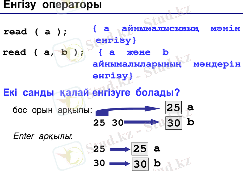 Бірінші жағдайда еңгізу операторы дұрыс орындалып, х, і, а айнымалыларына өздерінің типтеріне сейкес n, 30, 0. 1 мәндерін қабылдайды. Екінші түрінде а айнымалысының типі нақты, ал оған сәйкес мән ‘n’ символдық типті болғандықтан қателік туғызады. Егер бірнеше read операторы қатар жазылса, оларға қатысты мәндерді бір жолда тере беруге де болады.