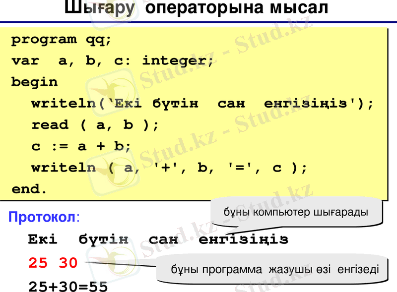 Компьютерде ең қарапайым есепті шығарғанда да мәліметтерді енгізу-шығару операцияларынсыз тынбайды. Кез келген программа қандай да бір мәліметтерді өңдеу негізінде нәтиже береді. Өңделетін мәліметтер сыртқы құрылымдардан шығып, компьютер жадына орналастырылады, ал нәтиже, керісінше, жадыдан сыртқы құрылымға беріледі. Паскаль тілінде пайдаланушы мен компьютердің мәліметтер алмастыру процесі программаның параметрлері болып қарастырылатын Input және Output стандартты файлдарының кемегімен іске асырылады. Программада өңделетін мәліметтерді Input файлынан оқиды да, өңделу нәтижесін Output файлына жазады. Стандартты Input файлы ретінде клавиатура, Output - файлы ретінде дисплей тағайындалған. Олар программаның параметрлеріндс корсестілмеуіде мүмкін. Жалпы, файлдардан мәліметтерді оқу және оларға жазу әрекеттерін read, writh, readln, writeln операторлары орындайды. Әзірше біз осы операторлардың мәліметтерді клавиатурадан енгізуде және дисплейге шығаруда пайдалану жолдарын қарастырамыз.