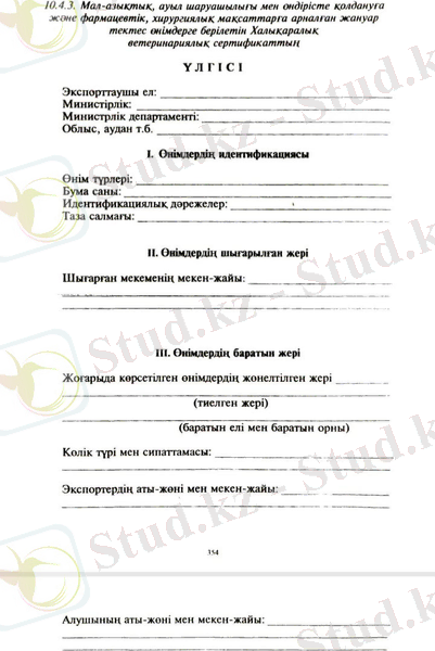 Жануар тектес өнімдер, оның ішінде биологиялык дәрі-дәрмектер тасымалдау кезінде оларға ел ішіндегі тасымалдауда жалпы формадағы сертификаттар, ал импорттық және экспорттық тасымал кезінде Халықаралық үлгідегі ветеринариялық сертификат толтырылады.